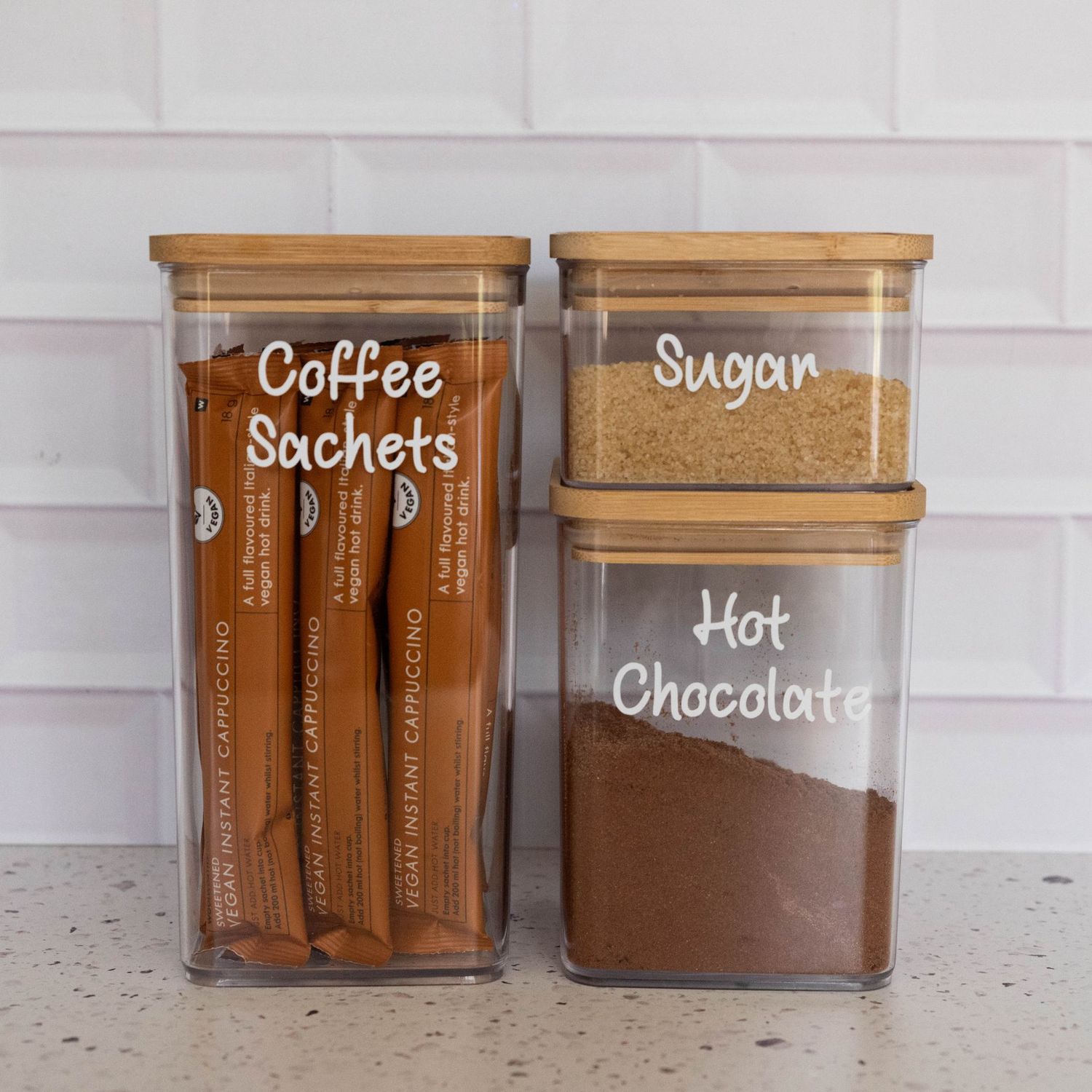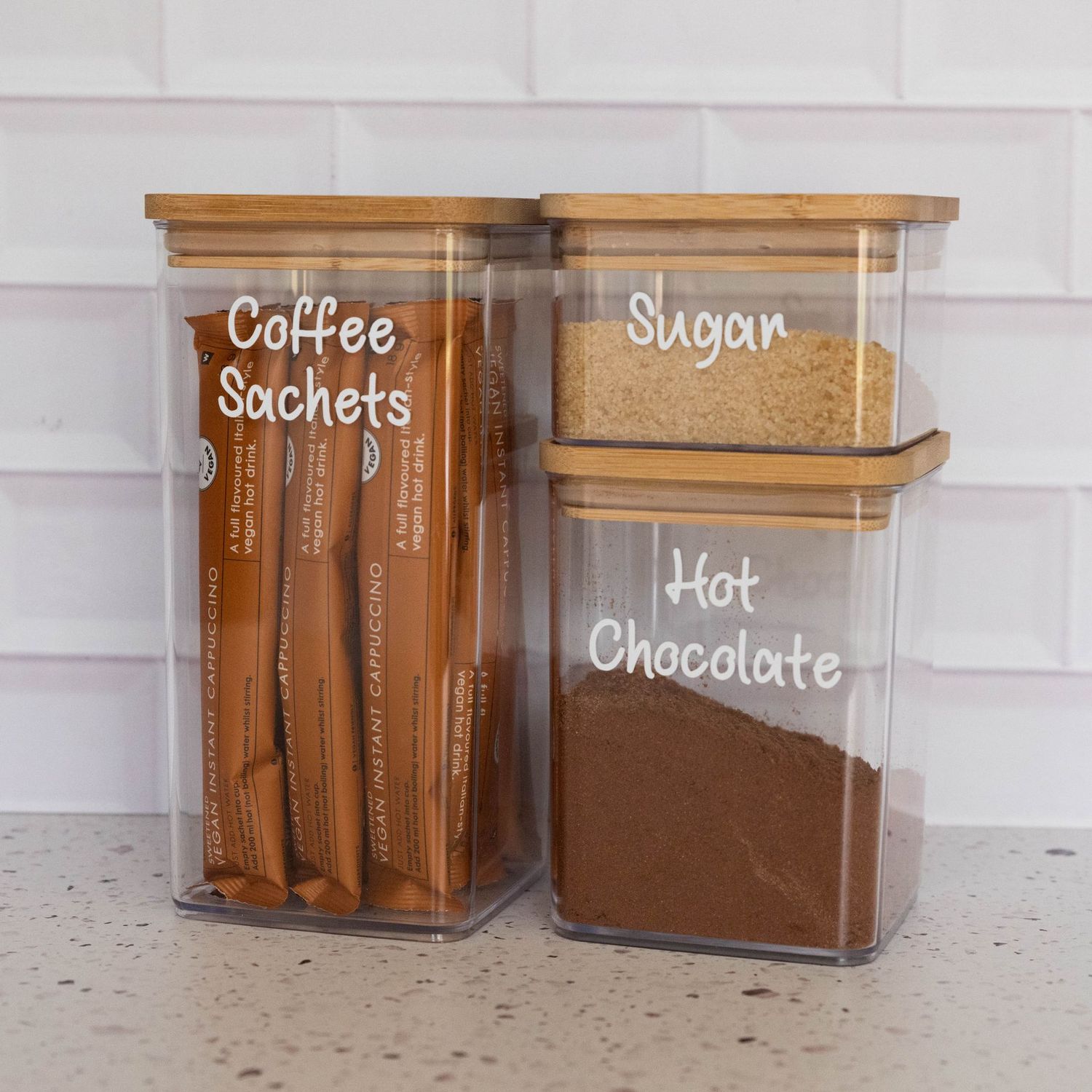 Labels and food are not included. It is just to showcase the product and show you how it may be used, and what labels can be ordered.Labels can be ordered separately. The labels shown here are called “White Chocolate Font”, 1.5cm-2cm, in the colour white.
