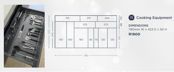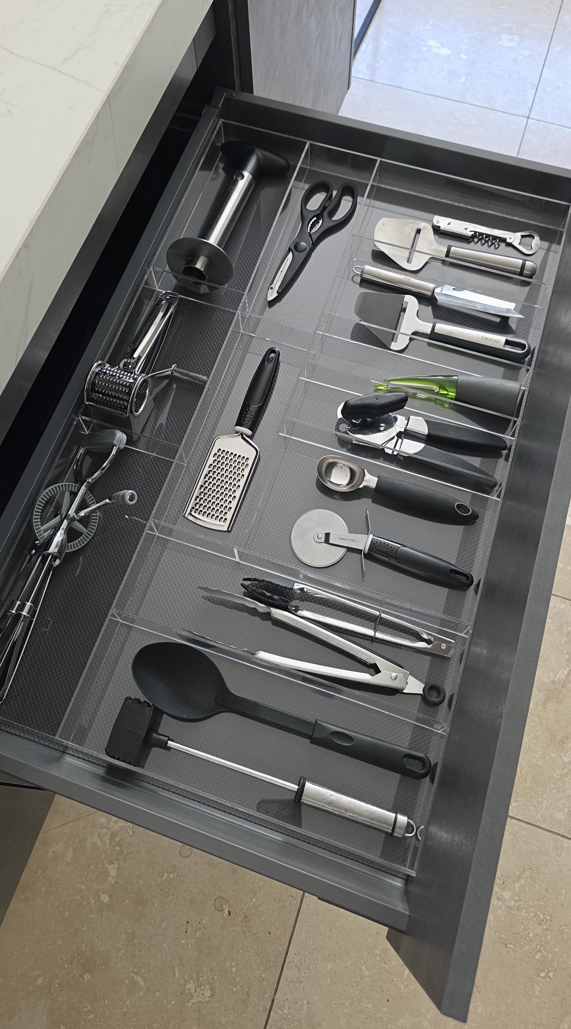 Cooking equipment is larger, heavier, and used daily — which is exactly why it needs a dedicated storage solution. The Cooking Equipment Drawer Insert is designed to organise bulky kitchen tools such as mashers, graters, pizza cutters, tongs, scissors, and specialty prep tools without clutter or overlap.