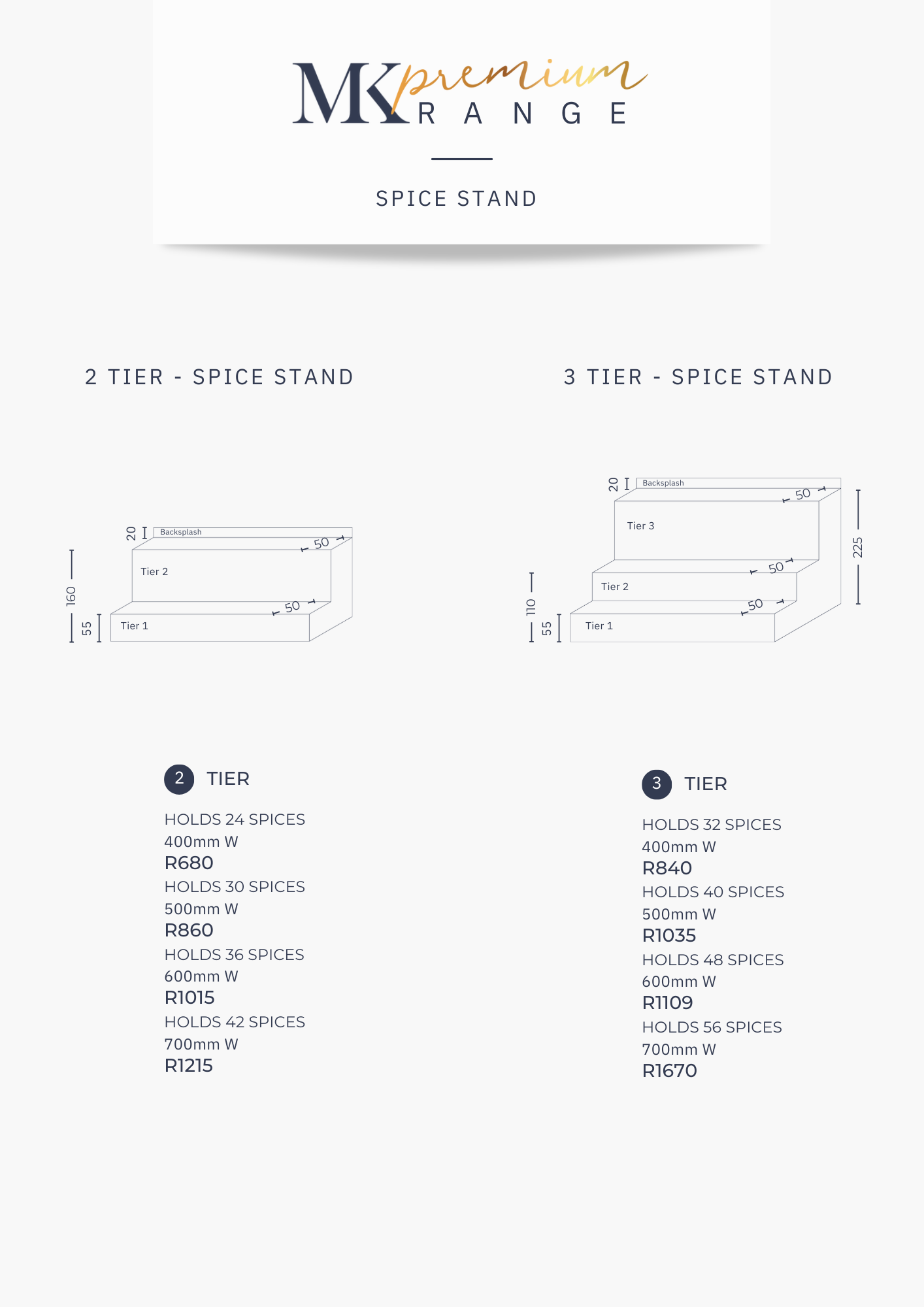 - 700mm W (HOLDS 56 SPICES)
