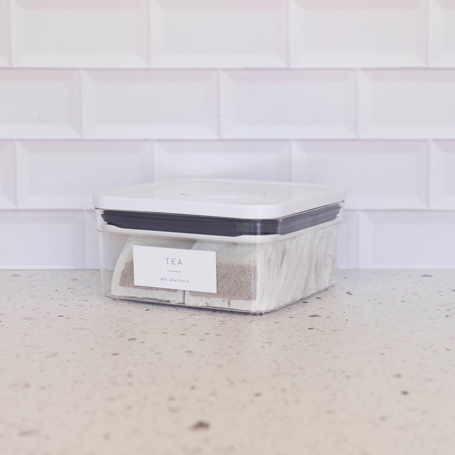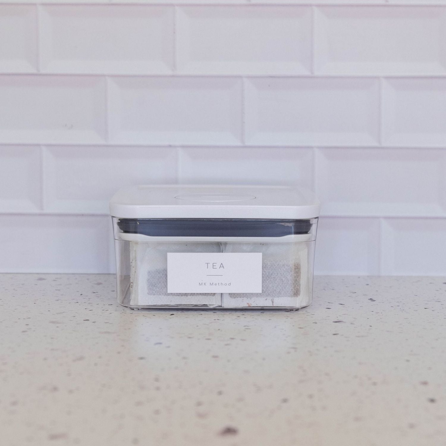 Labels and food are not included. It is just to showcase the product and show you how it may be used, and what labels can be ordered. Labels can be ordered separately. The labels shown here are called “White Minimalist labels” 7cm x 3cm”, white. The name ‘MK Method’ comes standard on the bottom of the label and can be changed to your own “Pantry Name” whilst placing your order.